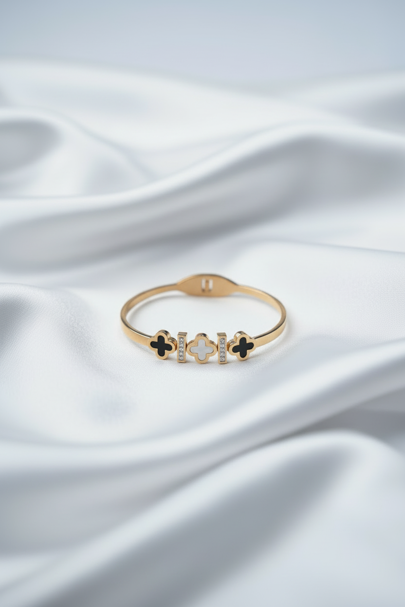 A modern take on a timeless motif. This structured gold-tone bangle features a stunning centerpiece of three clovers: two deep onyx-black enamel clovers flanking a central mother-of-pearl style white clover. Separated by shimmering pavé crystal bars, this piece offers a balanced, high-end look.